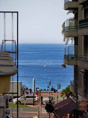 We have recently moved into a new apartment in the centre of the pedestrian/restaurant area. It has large French doors and little Juliet balconies across the front. We almost have a sea view. If you step out onto the little balcony, lean out a bit, and look to the left you can see the sea. It is about a 3 minute walk to the beach and it is lovely to walk along the waterfront in the early morning or in the evening.